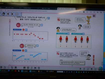 「2拍子」と「3拍子」の曲を聴き、そのちがいを感じ取っています。