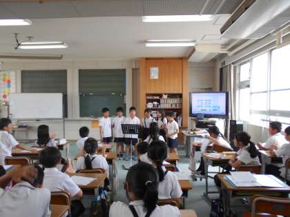 2分音符、4分音符、8分音符にそれぞれ言葉を当てはめ、リズムアンサンブルを発表しています。