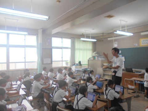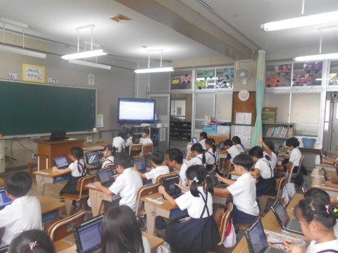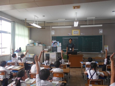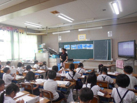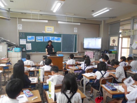 国語の授業です。「くじらぐも」の場面の絵を見て、それぞれの様子を思い浮かべています。
