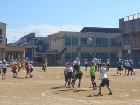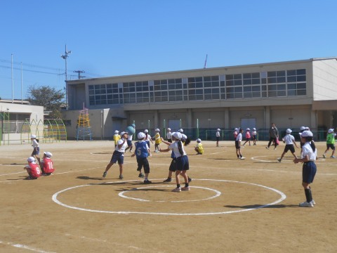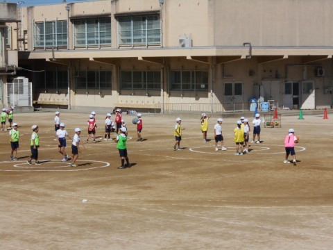 体育の授業です。「サークルシュートゲーム」に取り組んでいます。
