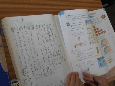 算数の授業です。九九の「2の段」の学習に取り組んでいます。
