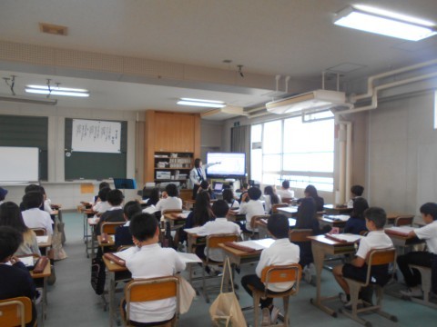 外国語活動の授業です。「What time is it ?」の表現を学習しています。