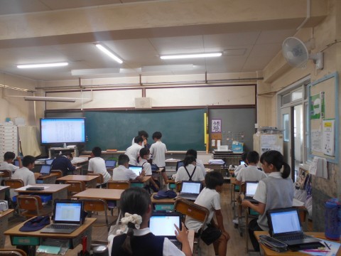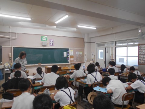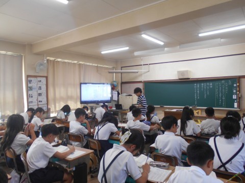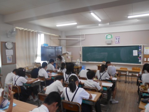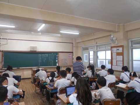 臨海学校の次の日ですが、元気に登校してきました。臨海学校をふりかえって、原稿用紙やタブレットで作文にしています。