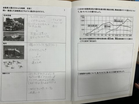 自動車工場について学習しています。自動車ができるまでの動画を見て、気づいたことをワークシートに書き込んでいました。