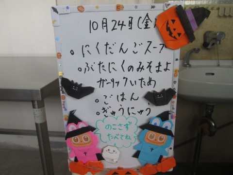 給食場の配膳見本には「ラブブ♡」が登場し、子どもたちもすごい反応でした。調理員さんが折り紙で作ってくれました。