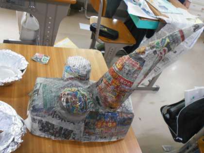 図工の授業です。「お面」を水のりで固めています。立体的に仕上がってきました。
