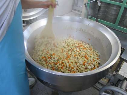カンジャは、鶏肉のスープにお米が入っています。給食では無洗米を使いました。