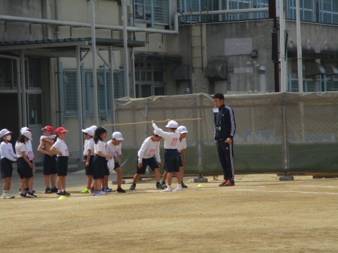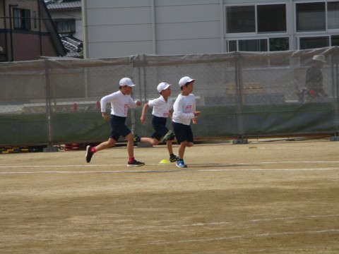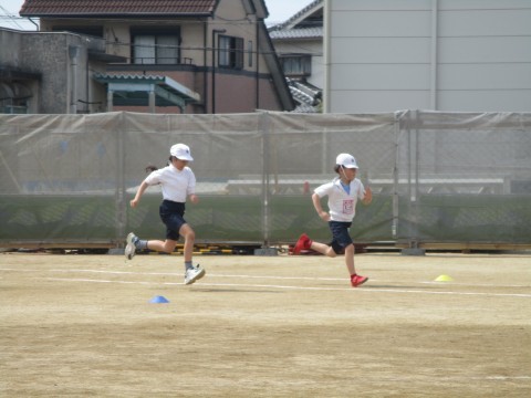 50メートルを走る練習です。腕のふり方、足の運び方に気をつけてゴールをめざします。