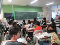 先生が自主学習ノートの紹介をしています。どんな点がよかったか、1学期よりも成長した部分をみんなに紹介しています。いい所は、どんどんまねっこしようね。
