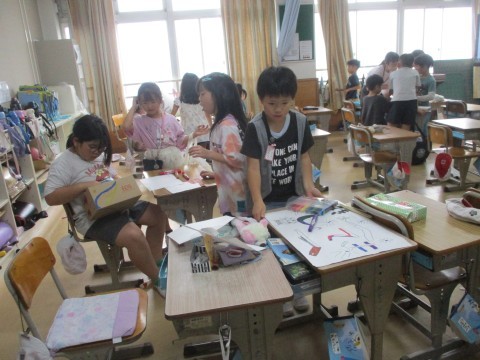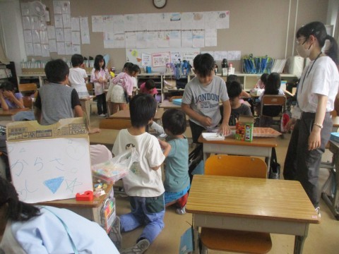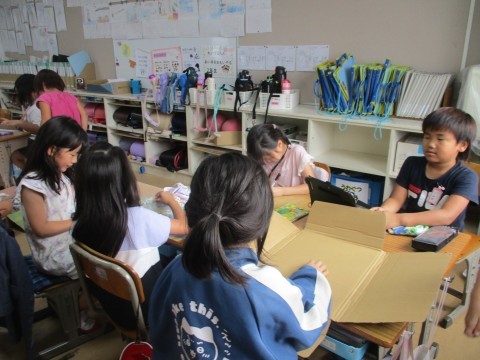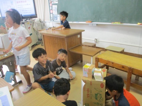 段ボールや折り紙、割りばしなど、いろいろな材料を使っておもちゃ作りをしています。どんなものが仕上がるか楽しみです。