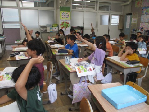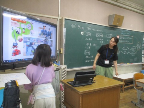 安全な暮らしを守る人たちについて学習しています。子どもたちからは、一番身近な人は、「見守り隊のみなさん」「けいさつ」という意見がでています。