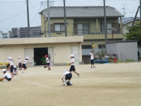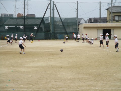 ボール遊びをしています。ボールをキャッチする、転がす、蹴る、投げるなどいろいろな方法に挑戦しています。