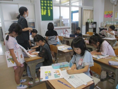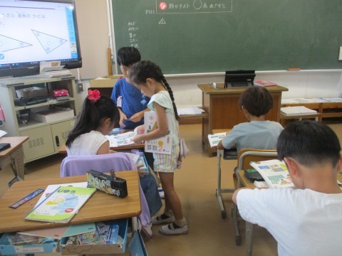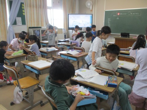 「かたち」のテストに向けて,問題を解いています。分からないとことは友だちに聞いてもOKです。