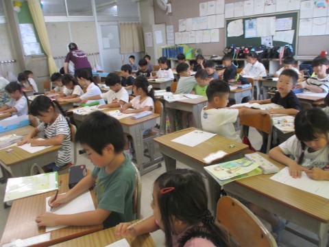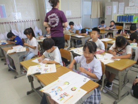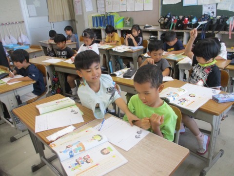 「ありがとうがいっぱい」の教材を読んで,どんな時どんな人にお世話になっているか考えています。お家の人,調理委員さん,見守り隊の方々などたくさんの人たちにお世話になっていることを感じています。