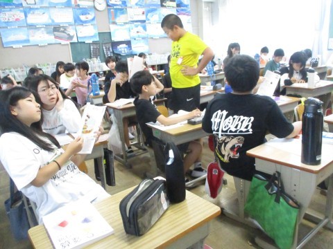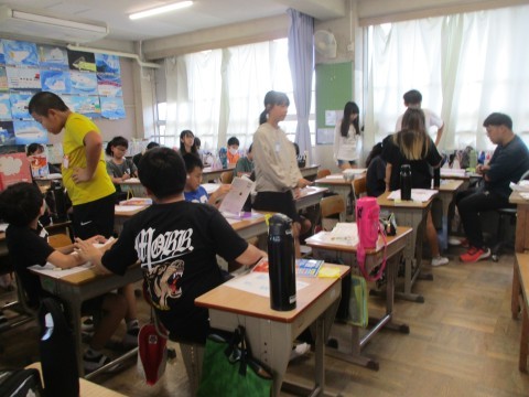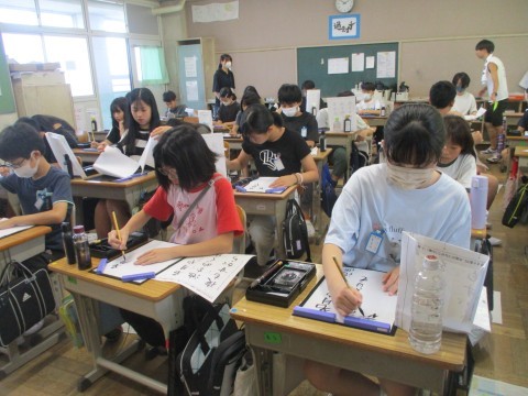 今までとは違って,細筆で半紙に「名月や池をめぐりてよもすがら」と字数の多い文を書きます。難しそうですが,子どもたちはしっかり取り組んでいます。