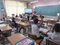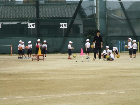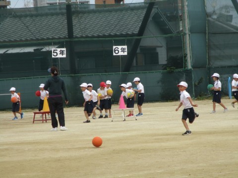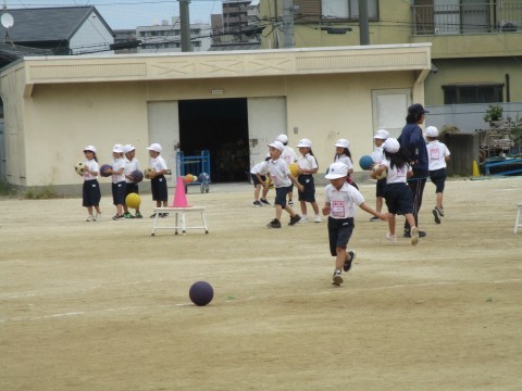 ボール遊びをしています。コーンに向けてボールをあてています。ボールを追いかける姿も楽しそうです。