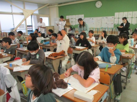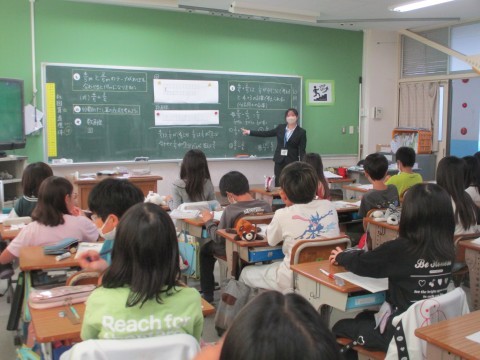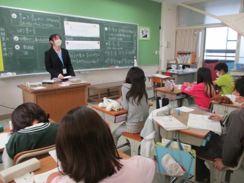 教育実習生が算数の授業をしています。分数のたし算の方法を考えます。子どもたちは,活発に意見を出しています。
