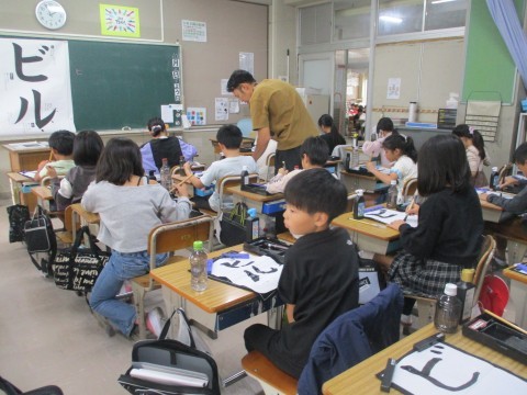「ビル」の字を練習しています。漢字,ひらがなの次は,カタカナです。