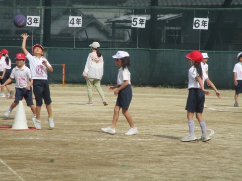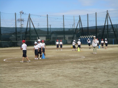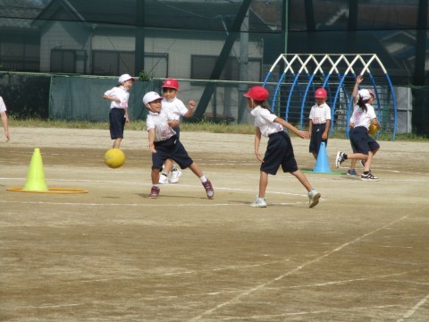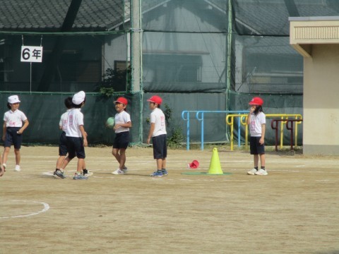 ボール運動をしています。コーンめがけて投げる人,それを防御する人がいます。