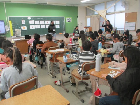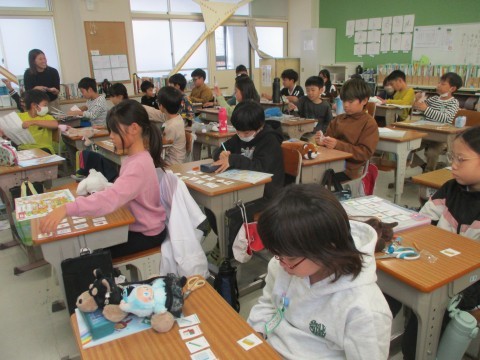 文房具の名前を覚えています。KC先生が発音した後にみんなで発音しています。