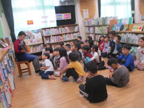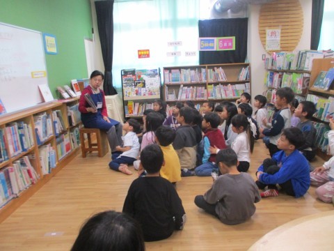図書の先生が,お話を読んでくれています。子どもたちは,真剣に聞いています。