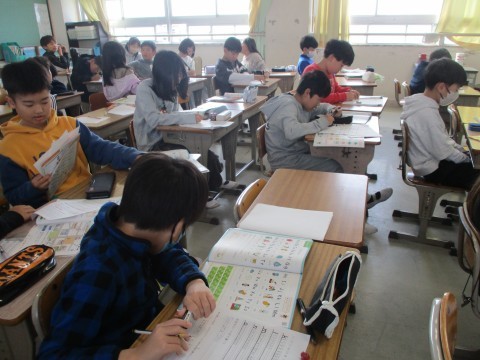 町の施設の名前を覚えています。その後,アルファベットの練習プリントに取り組みました。