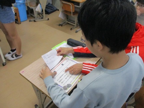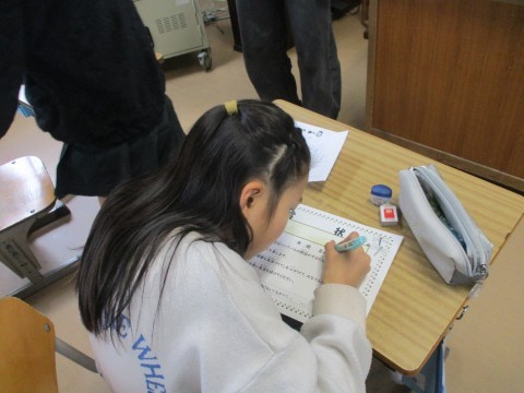 健康啓発標語コンクールの表彰を作っています。もらった人が喜ぶように,心をこめて書いています。