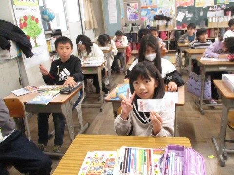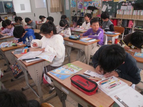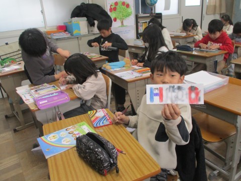 KC先生のために,ローマ字でネームカードを作っています。色鉛筆を使ってきれいにいろぬりしたり,自分の好きなイラストを描いたりしています。