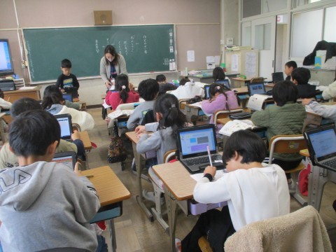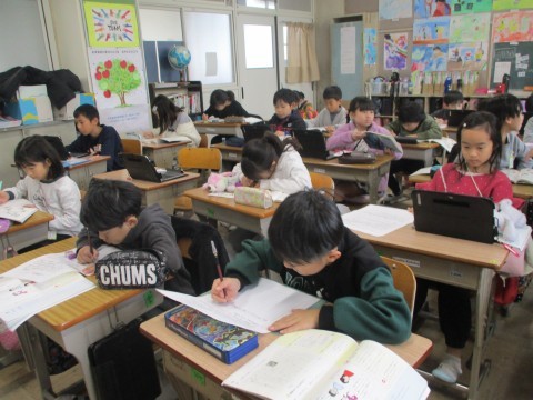 作文の清書ができた人は,詩を考えてノートに書いています。