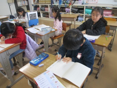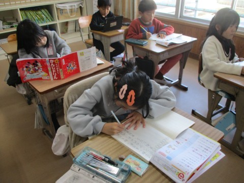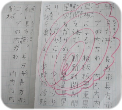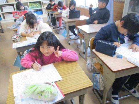 漢字の練習をしています。「先生見て!花丸やでぇ~」とノートを見せてくれます。