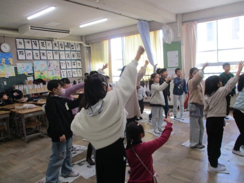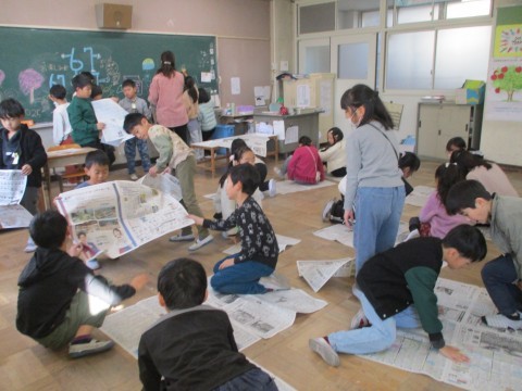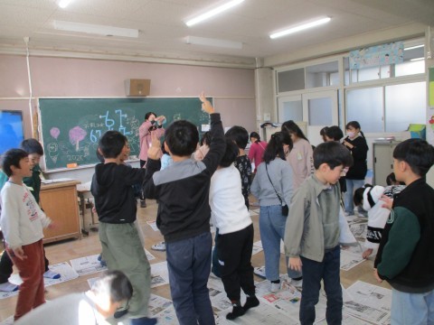 新聞紙を使って,みんなでゲームを楽しんでいます。