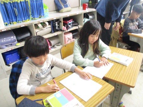 おんどく・けいさんカードの表紙をていねいに,色ぬりしています。