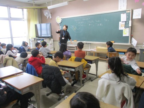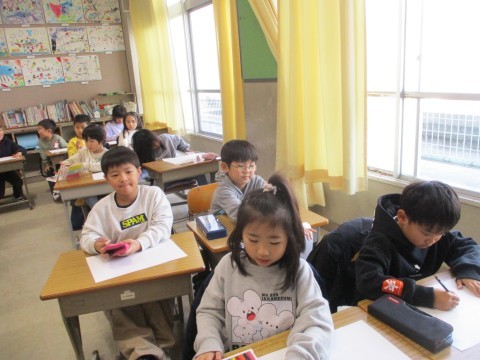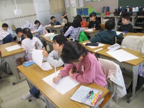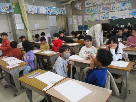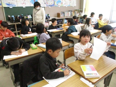 紙はんがのデザインを考えています。子どもたちからは,「おはな」「りゅう」「くじゃく」「へび」「おに」など,たくさんのアイディアが出ています。