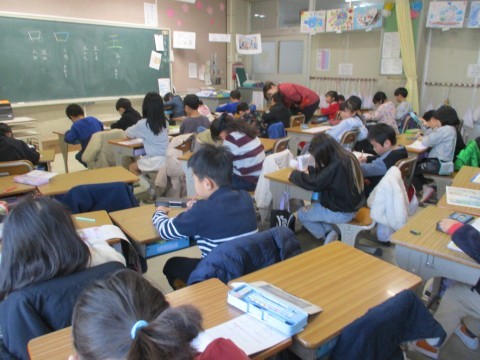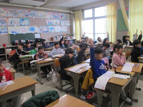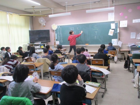 新出漢字の「王」と「口」の練習をしています。言葉集めでは,子どもたちは元気に発表しています。