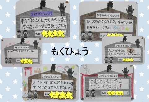 2年生のみんなが3学期の目標を考えました。「しっかり運動する」や「字をきれいにかく」,「友だちと仲よくする」「九九をスルスル言えるようにする」など,しっかり考えていて素敵です。