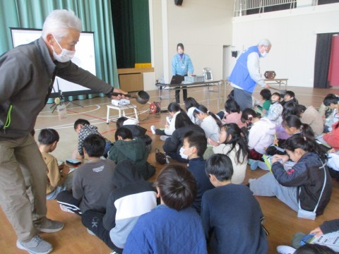 堺市博物館から「むかしの暮らしを知ってみよう」の出前授業に来ていただきました。むかしの道具やおもちゃなどたくさん持って来ていただき,子どもたちは興味津々です。