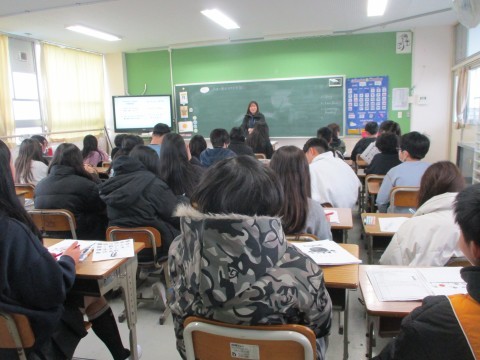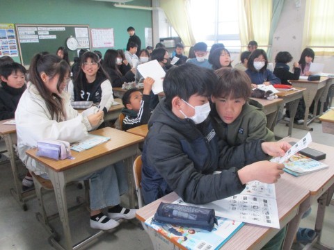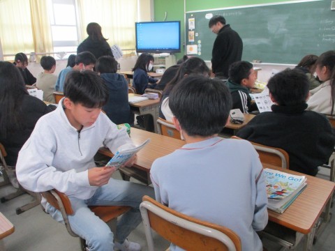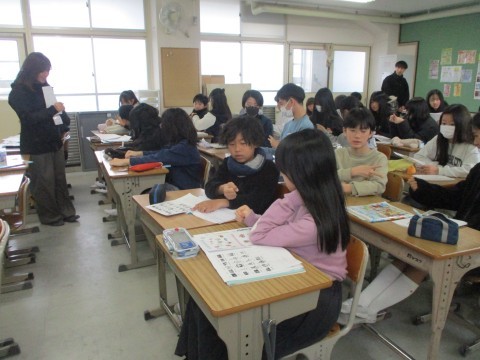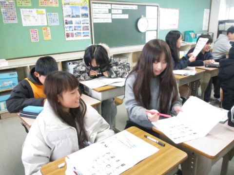 カントリーロードの歌を歌ったあと,ペアで「一分間クイズ」をしています。