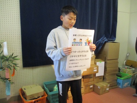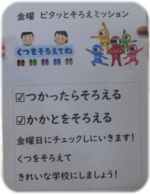 明日から代表委員会が「あいさつ運動」を行います。体育美化委員会から,「ピタッとそろえミッション」くつをそろえよう!と呼びかけがありました。みんなで気持ちのよい学校づくりを進めています。