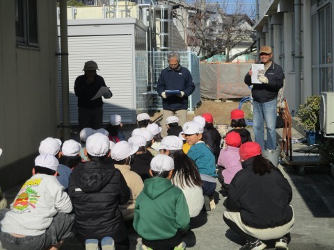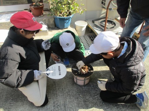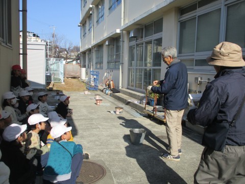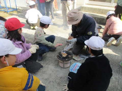 地域コディネーターの木村さん,北口さん、北田さんに火の起こし方を丁寧に教えていただきました。子どもたちはマッチで火をつけるのは大変難しいようです。しかしおそれず,思いっきりよくマッチをすっていました。よくかわいた松の葉や木などを用意していただいていたので,どの班もうまく炭が真っ赤にいこっていました。炭を使っているお家はほとんどないので,子どもたちにとっていい体験でした。