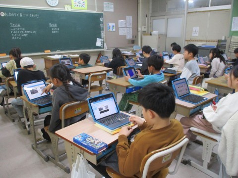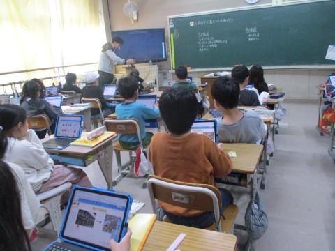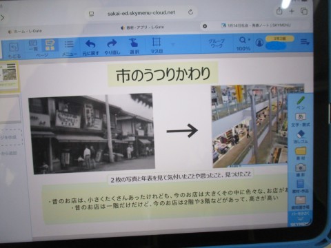 今と昔のお店の様子の写真を見比べて,気づいたことを発表ノートにかいてみんなで意見を共有しています。