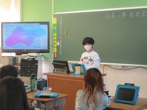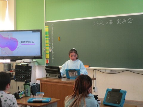 自分の「将来の夢」について発表しています。子どもたちは,夢を選んだ理由やその夢を叶えるために今できることを自分の言葉で発表しています。