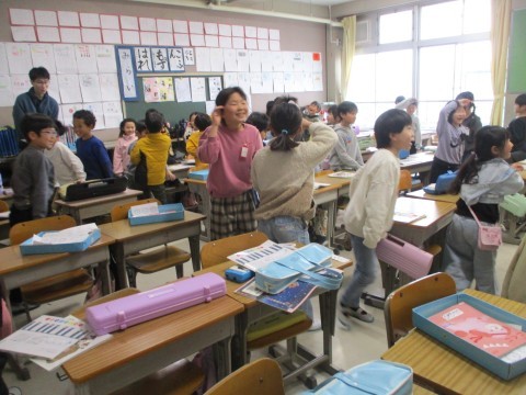 チャイコフスキー作曲の「こうしんきょく」の合わせて教室を行進しています。