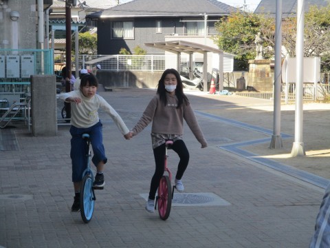 4年生が花いちもんめをしています。なわとびの練習やいちりんしゃを楽しんでいる人もいます。