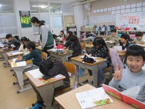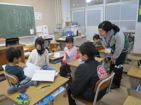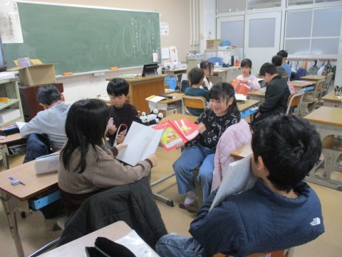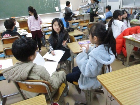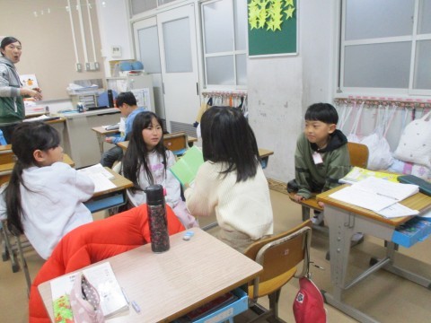 ス-ホや白馬の気持ちを物語から読み取ります。読み取った意見をグル-プの友だちと交流しています。