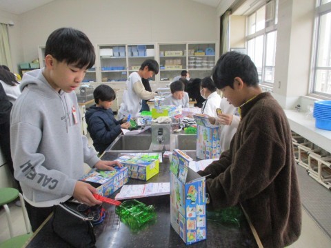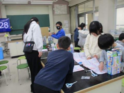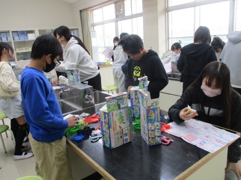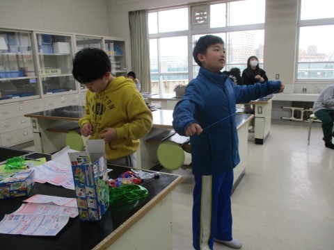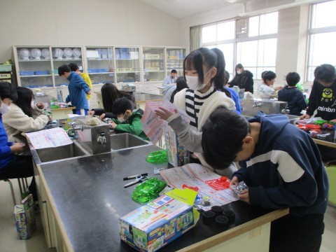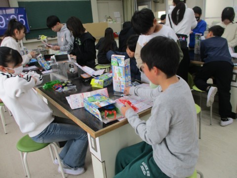 「電池と電磁石」の学習です。説明書を見ながら車を組み立てているようです。
