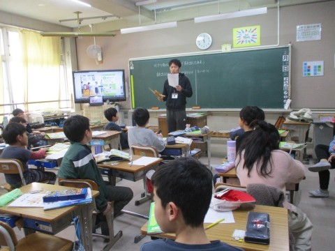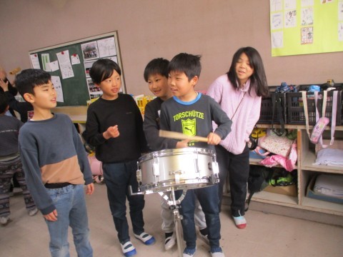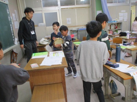 楽器や身の回りの物をつかって,音を出して気づいたことをプリントに書きます。
