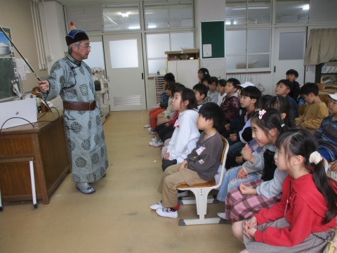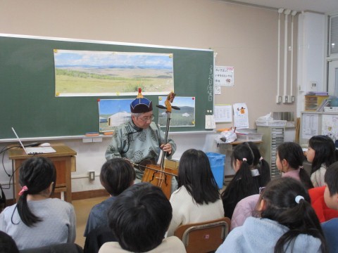 2年生の国語の教科書には「スーホの白い馬」というお話が載っています。このお話にはモンゴルの民族楽器である馬頭琴が登場します。そこで,今日は馬頭琴の演奏者である先生に来ていただきました。壮大なモンゴルの生活やそこで暮らす人々のお話の後,馬頭琴の生の演奏を聴かせていただきました。子どもたちは,とても興味をもってお話を聞いていました。