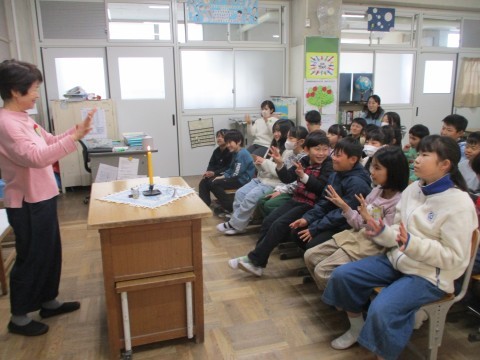 お話ふくろうの方が, むかし話などを耳から楽しんだり,手遊びも教えてもらいました。ろうそくの光の中でじっくりとおはなしに耳を傾けています。