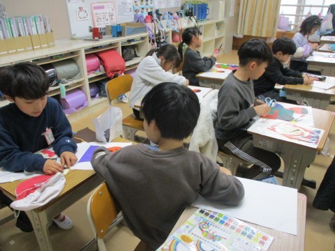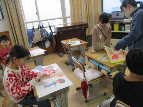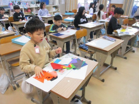 紙版画に取り組んでいます。思うように色紙を切るのが難しそうです。
