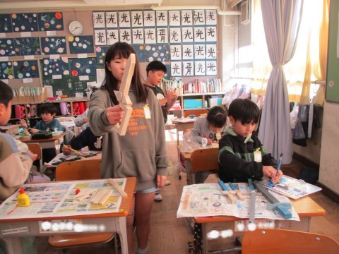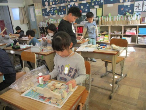 切った木材を「つなげて」「重ねて」「合わせる」で,作品を作っています。何ができるかお楽しみです。